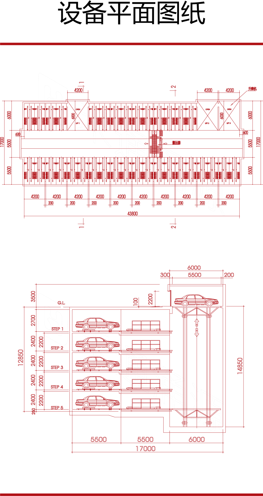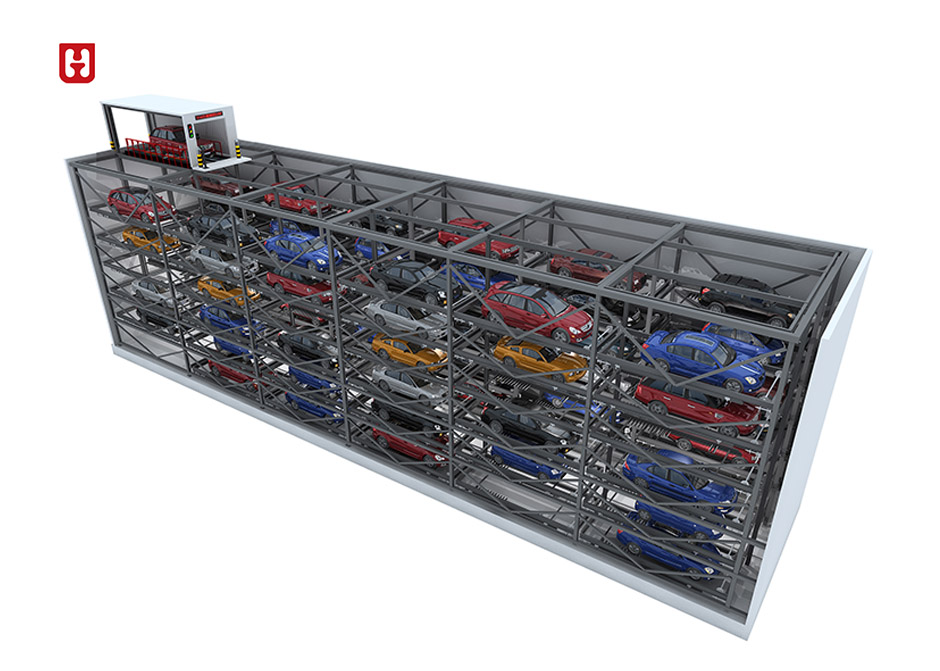 设备构成:进出口(存取车操作位置),固定升降机,旋转盘(调整车辆方向,便于车辆出库,根据需要配置),水平台车(在车库内运送车辆的装置),车辆存取台(存取车装置),停车装置(独有的梳架停车装置控制中心构成)。该类型主要用于半地下,地上有高度空间且中间层面可做他用。在系统的每一层都有至少一台横移车负责本层的车辆存取,由升降机将不同的停车层与出入口相连,车辆只需停到出入口,存取车全过程均由系统自动完成。此系统适用于地下和建筑内部,本设备可以满足地上或地下从2层车库到10层车库的使用要求,实现自动化快速安全存取车。